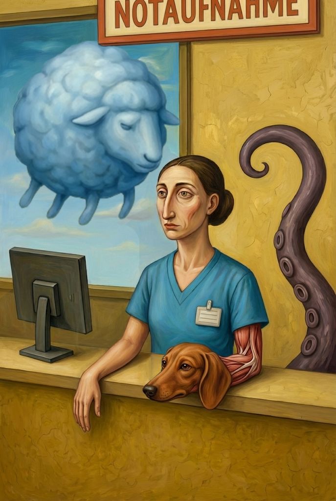 ▷ Auszug: Der Esstisch aus resopalbeschichtetem Flüssiggussholz reflektierte das grelle Licht des Deckenpaneels wie eine bleiche Haut. Der Filter an der Wand surrte ungleichmäßig, aus den Lüftungsschlitzen drang ein schwacher Geruch nach ozongetränkter Luft. Auf den Tellern lagen müde Tofuwürstchen. Die Hüllen glänzten feucht neben dunklen Brotscheiben und einem Klecks Senf.