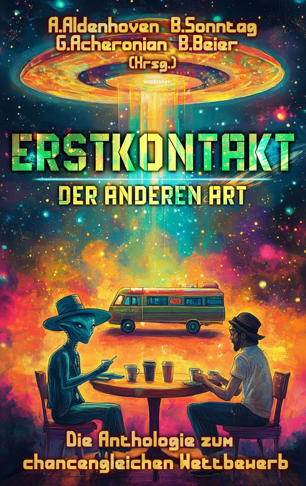 | Anthologien und Magazine 2025 | »Die Geister, die wir riefen« in Axel Aldenhoven, Beatrice Sonntag, Galax Acheronian und Björn Beier (Hrsg.), »Erstkontakt der anderen Art«, 2025, BoD, Erstveröffentlichung, ISBN: 978-3-7693-6714-0, Science-Fiction(Auszug: "Das Messer verborgen in seiner Jackentasche, die Finger klammernd um den Griff gelegt, als wäre es ein Rettungsanker im Meer der Ungläubigen, stand Bernhard am Rand der belebten Straße in der Kölner Innenstadt. Die Mittagshitze lag wie eine bleierne Decke auf der Stadt, doch in seinem Inneren brannte etwas anderes - eine Flamme, genährt durch jahrelangen Zorn und Enttäuschung, angeheizt von den Worten jener, die ihm die Augen geöffnet hatten. Diese Welt war krank, schmutzig. Sie musste gereinigt werden durch die edelste Form der Da'Wa, der Einladung, den Islam anzunehmen. »Allahu akbar«, murmelte er, die Lippen kaum spürbar bebend. Ein kleines Mädchen zeigte im Vorübergehen auf ihn, sagte etwas, das wie »Rübezahl« klang. Ihre Mutter zerrte sie rasch weiter, Bernhard ignorierte sie. Er bemerkte, wie seine Hände leicht zitterten, doch er wusste, es war nicht die Angst, die sie zittern ließ. Es war Vorfreude. Er dachte an die Videos, die er gesehen hatte, die Predigten, die ihm erklärt hatten, dass dies der Weg sei. Der Weg, den Gott für ihn vorgesehen hatte. Der Weg, der ihn, evangelisch getauft und konfirmiert, wie er sich mit Schaudern erinnerte, noch während des Besuchs der römisch-katholischen Bekenntnisschule in Dormagen zum Salafismus hatte finden lassen: zum einzig wahren Glauben, zum Islam. Wenn er heute fiel, würde er als Märtyrer ins Paradies eintreten. Das Blut der Ungläubigen würde ihn reinigen, ihm den Platz im ewigen Frieden sichern. [...] So betrachtete Bernhard sie nun, diese gottlosen angeblichen ehemaligen Affen. Sie lachten, trugen Einkaufstaschen, gingen zur Arbeit, tranken Sojalatte in den Straßencafés oder Alkohol in den Bars. Ihre Leben waren wertlos, ihre Seelen verloren in den Verlockungen dieser Welt. Sie sahen nicht, was er sah. Sie verstanden nicht die Macht, die sie lenkte. Sie würden es bald verstehen. Er zog das Messer, das Metall blitzte in der Sonne, das Licht stach ihm ins Auge und blendete ihn für einen Sekundenbruchteil. Und dann schrie er es heraus, lauter, kraftvoller: »Allahu akbar!« ") |