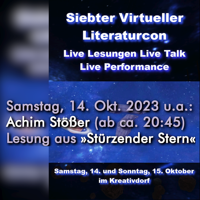 Interview Achim Stößer: Schriftsteller (ka-news 2003) (auch lokal). | Samstag, 14. Oktober 2023, Lesung aus »Stürzender Stern« beim siebten virtuellen Literaturcon der »Brennenden Buchstaben«.