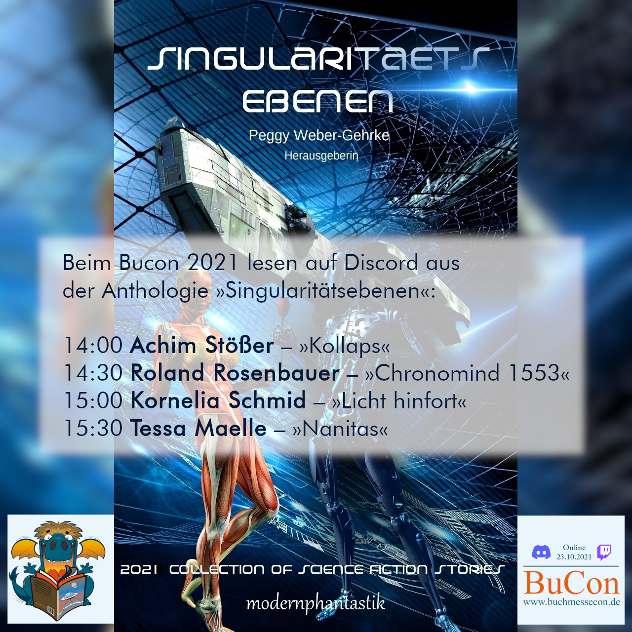 Lesung "Kollaps" beim BuCon 2021 am Samstag, 23. Oktober um 14 Uhr. Discord: Buchmesse Convent bzw. direkt Verlag Moderne Phantastik etc.) | |||